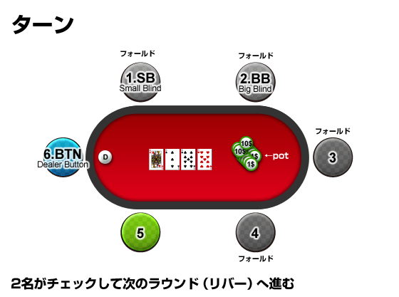 アクションの順番は、1(SB)→2(BB)→3→4→5→6(BTN)、と順番通りに行なっていきますが、今回1(SB)、3、4のプレイヤーはすでにフォールドしているので、残っているBB→5→BTNの順に行います。